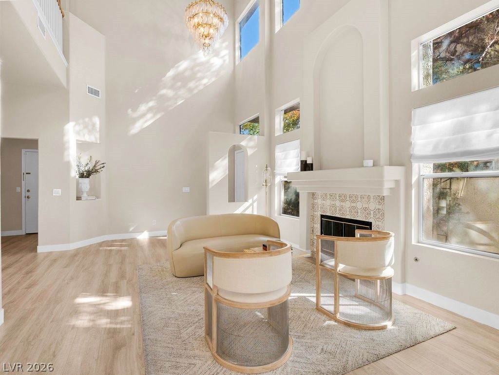 Welcome to Montaire at TPC Summerlin ? a gated golf course community offering privacy and convenience. This well-maintained 3-bedroom townhome features soaring ceilings, abundant natural light, and an open, functional layout. The dramatic double-height living room showcases a cozy fireplace and expansive windows, creating an airy feel. The dining area flows to the backyard patio, ideal for indoor-outdoor living. The kitchen offers generous counter space, ample cabinetry, and a breakfast bar overlooking the main living areas. Upstairs, the spacious primary suite includes a walk-in closet, dual sinks, soaking tub, and separate shower. Secondary bedrooms are well-sized and versatile. Low-maintenance backyard and gated community setting just moments from TPC Country Club, parks, shopping, and dining. Exceptional opportunity to own in one of Summerlin's most desirable communities.