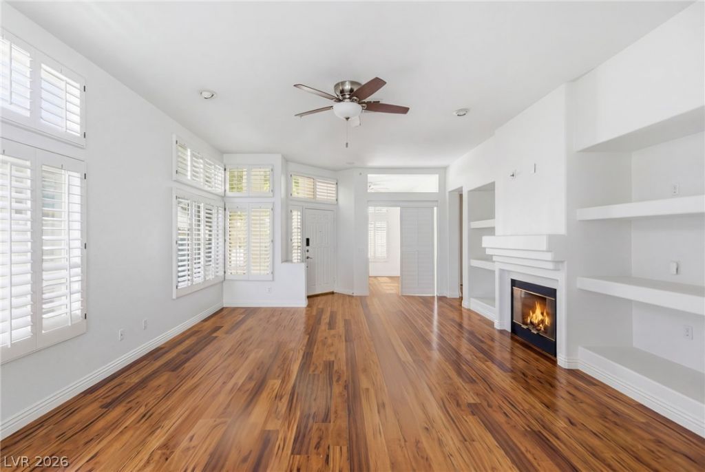 Completely refreshed, brand new paint and pre-inspected: 100% move-in ready with no repairs or maintenance needed. Premium Summerlin location in a well-maintained gated community on a quiet, low-traffic interior lot. This single-story townhome lives like a single-family home with only one shared wall (garage side). Smart split floor plan: 2 bedrooms + 2 baths plus a den/office that easily converts to a 3rd bedroom. Spacious primary suite features a large slider to the private backyard, custom walk-in closet, and a spa-like bath with extended dual-sink vanity, large walk-in shower with full glass enclosure and soap niche, and a separate soaking tub. Granite counters, stainless steel appliances all included, plantation shutters throughout, ceiling fans, with the perfect touch of a fireplace in the living room. Clerestory windows and raised ceilings flood the home with natural light. Lush, low-maintenance landscape with a quaint backyard firepit. Brand new main water line.